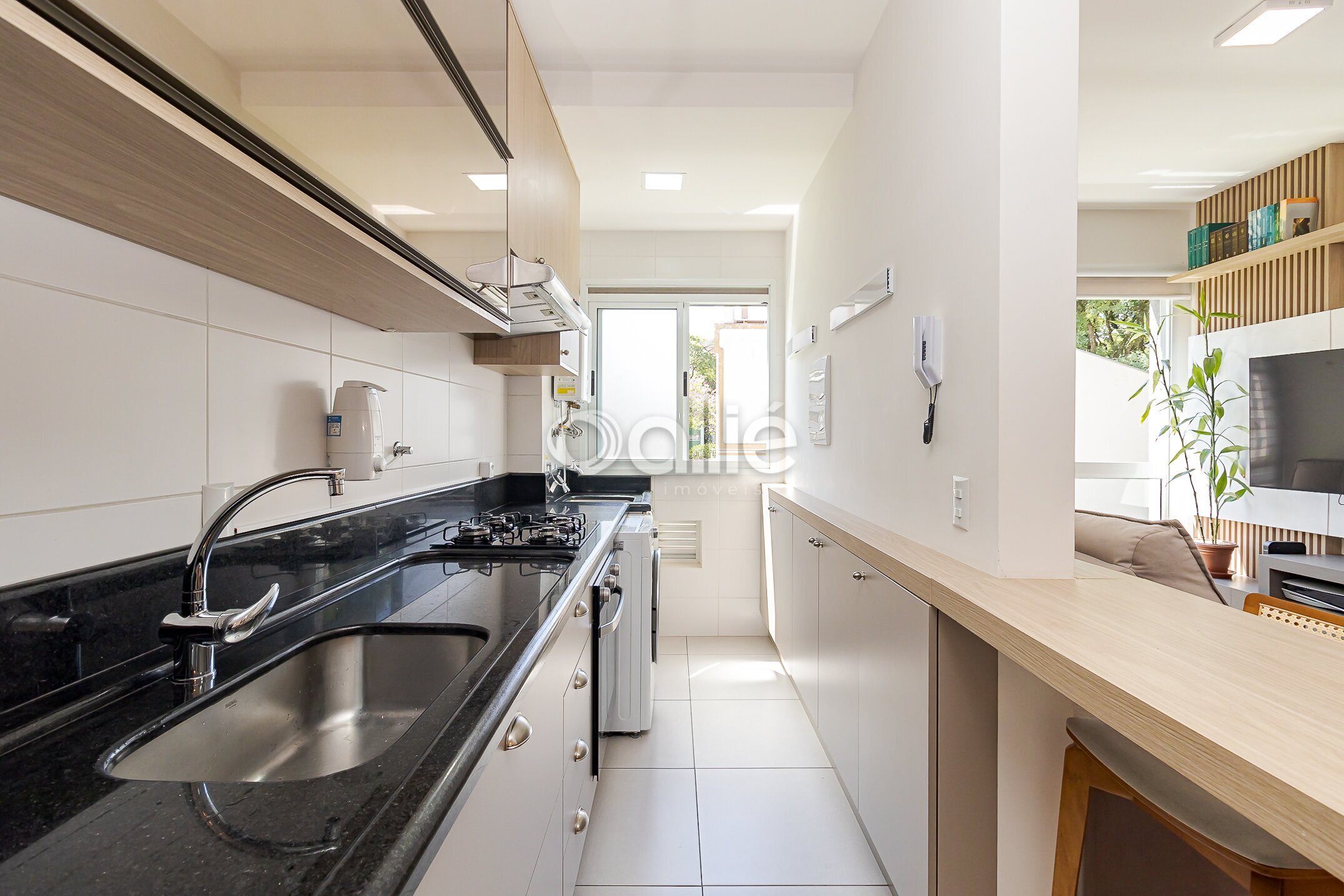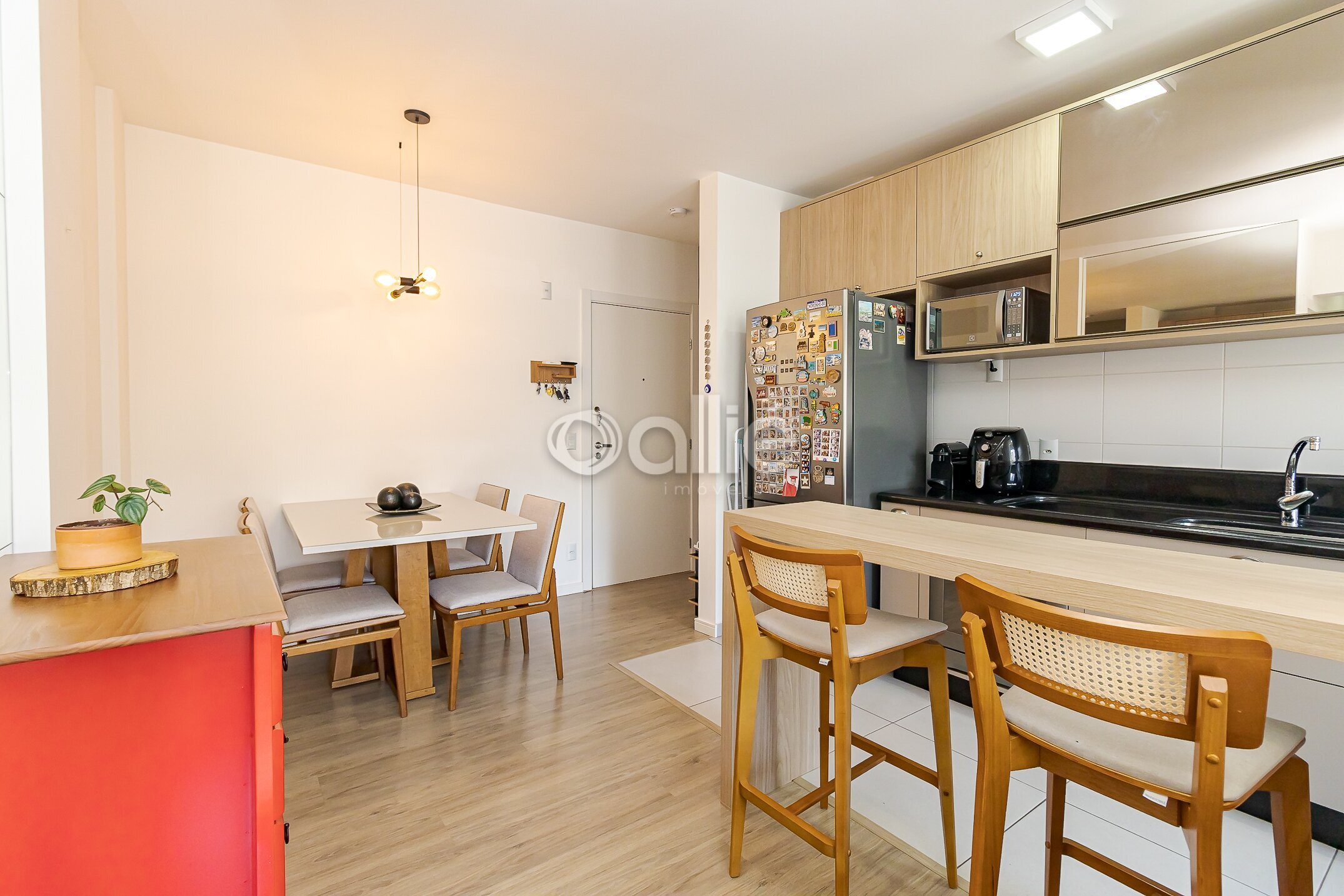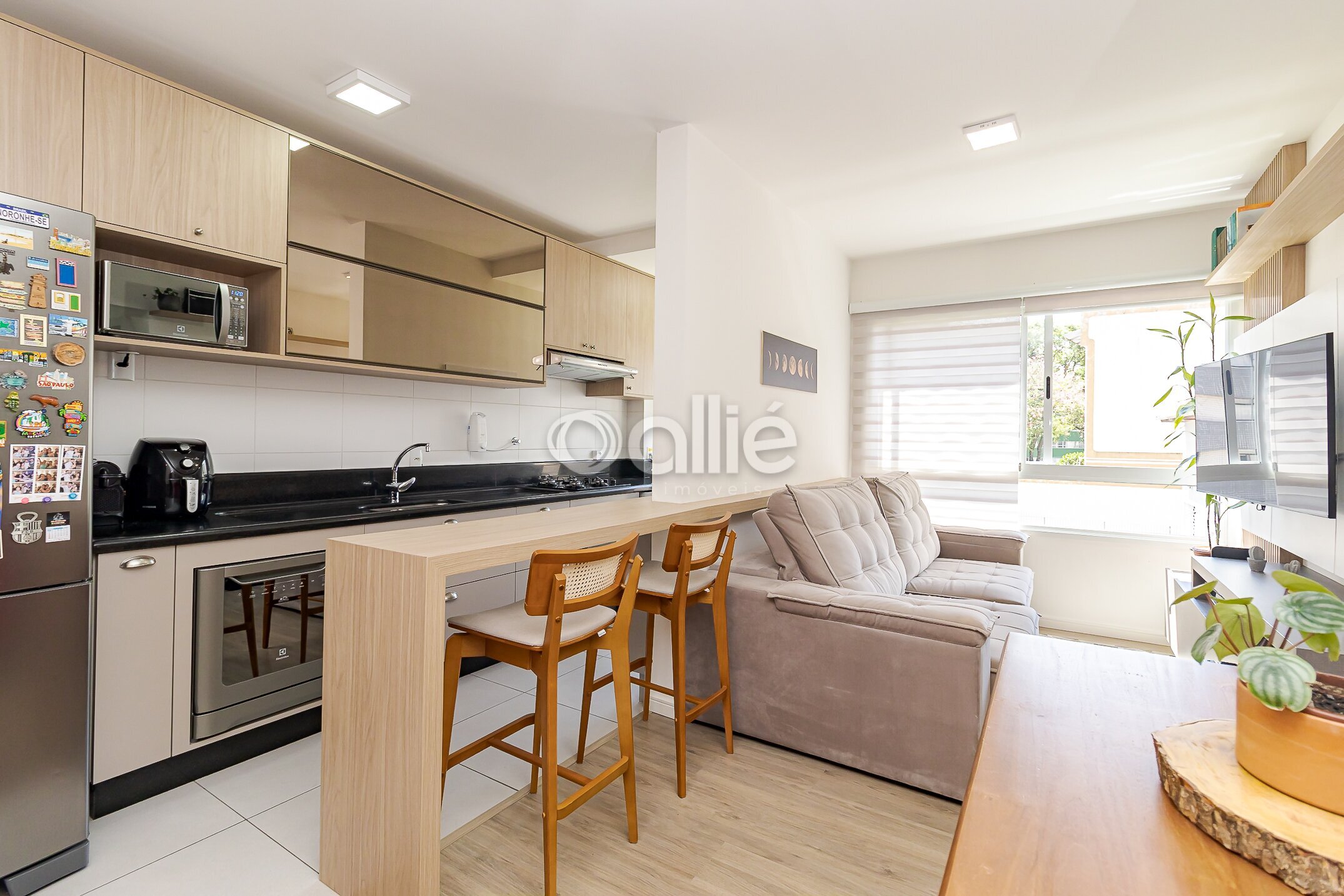 Salas de estar e jantar estão integradas a cozinha que esta completa em armarios planejados.