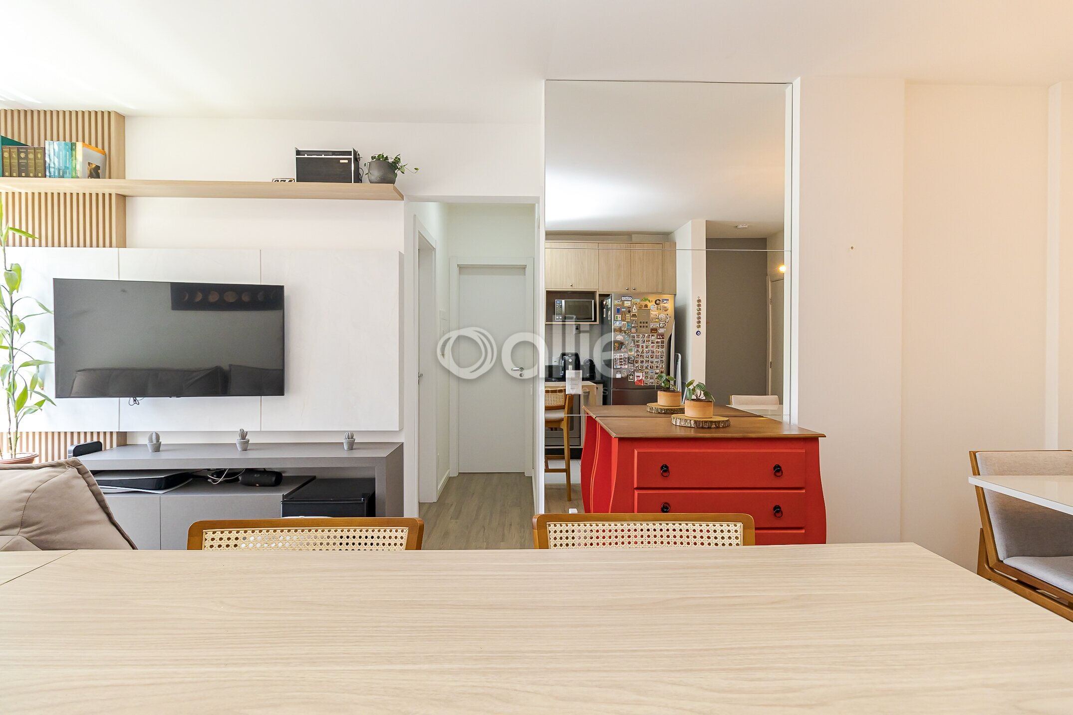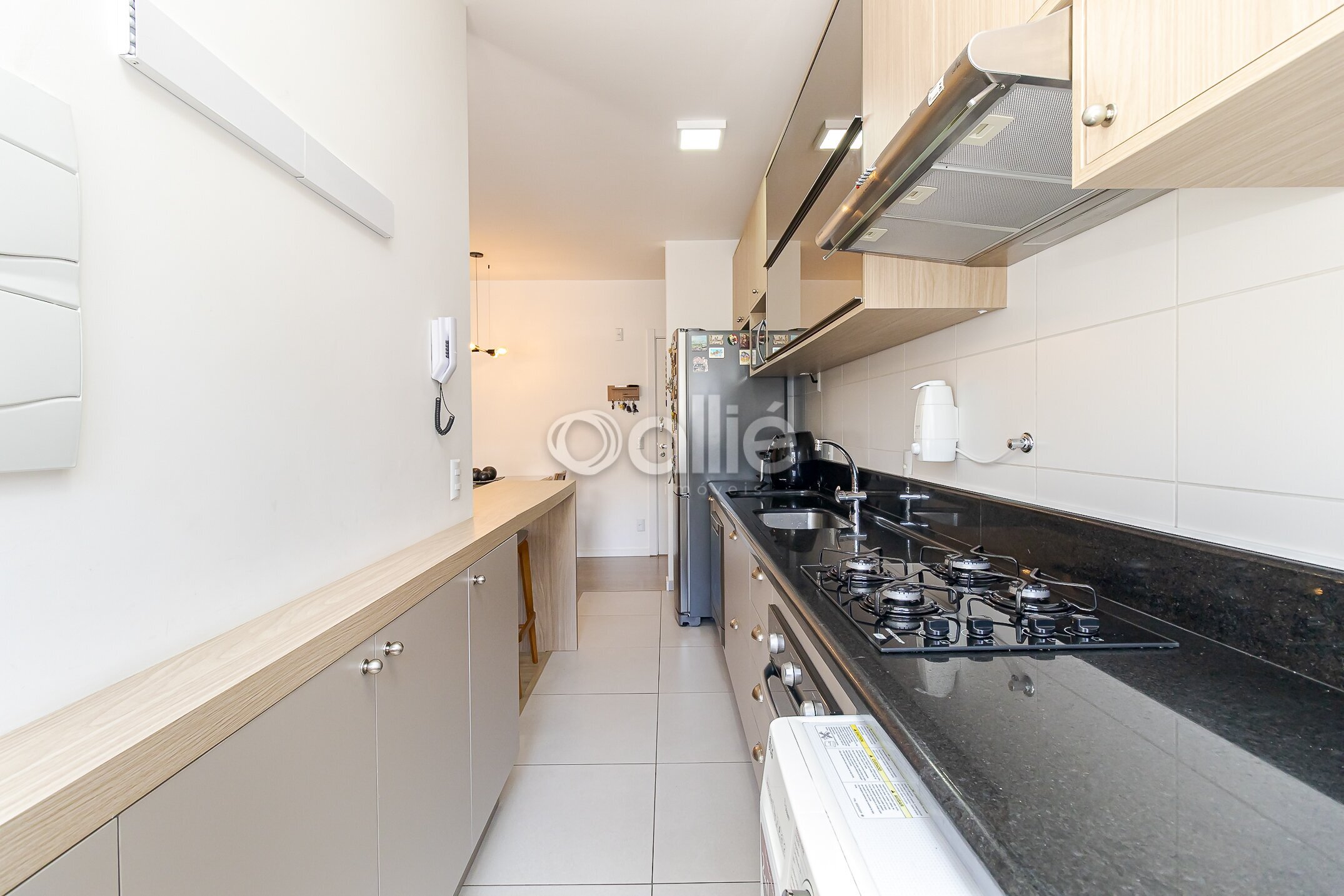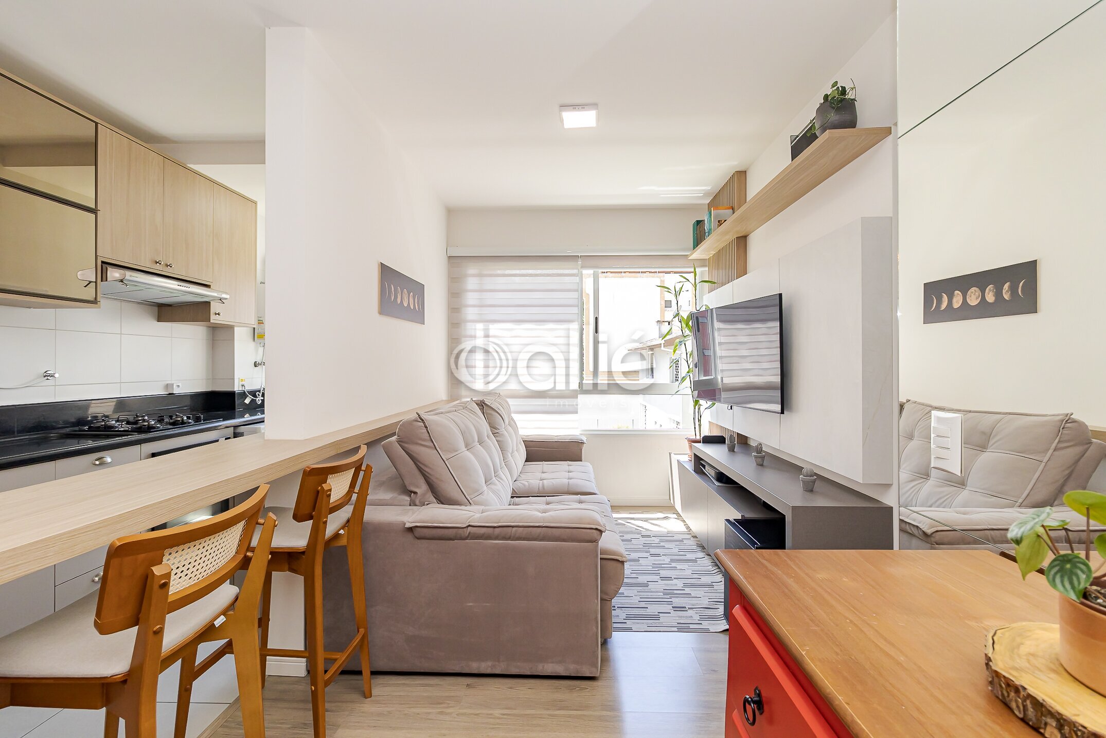 Salas de estar e jantar estão integradas a cozinha que esta completa em armarios planejados.