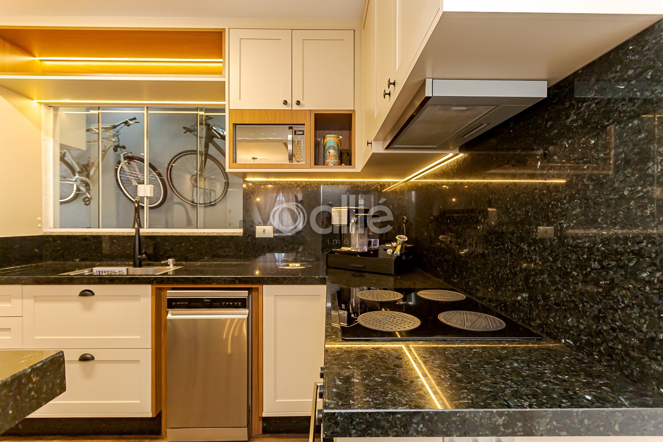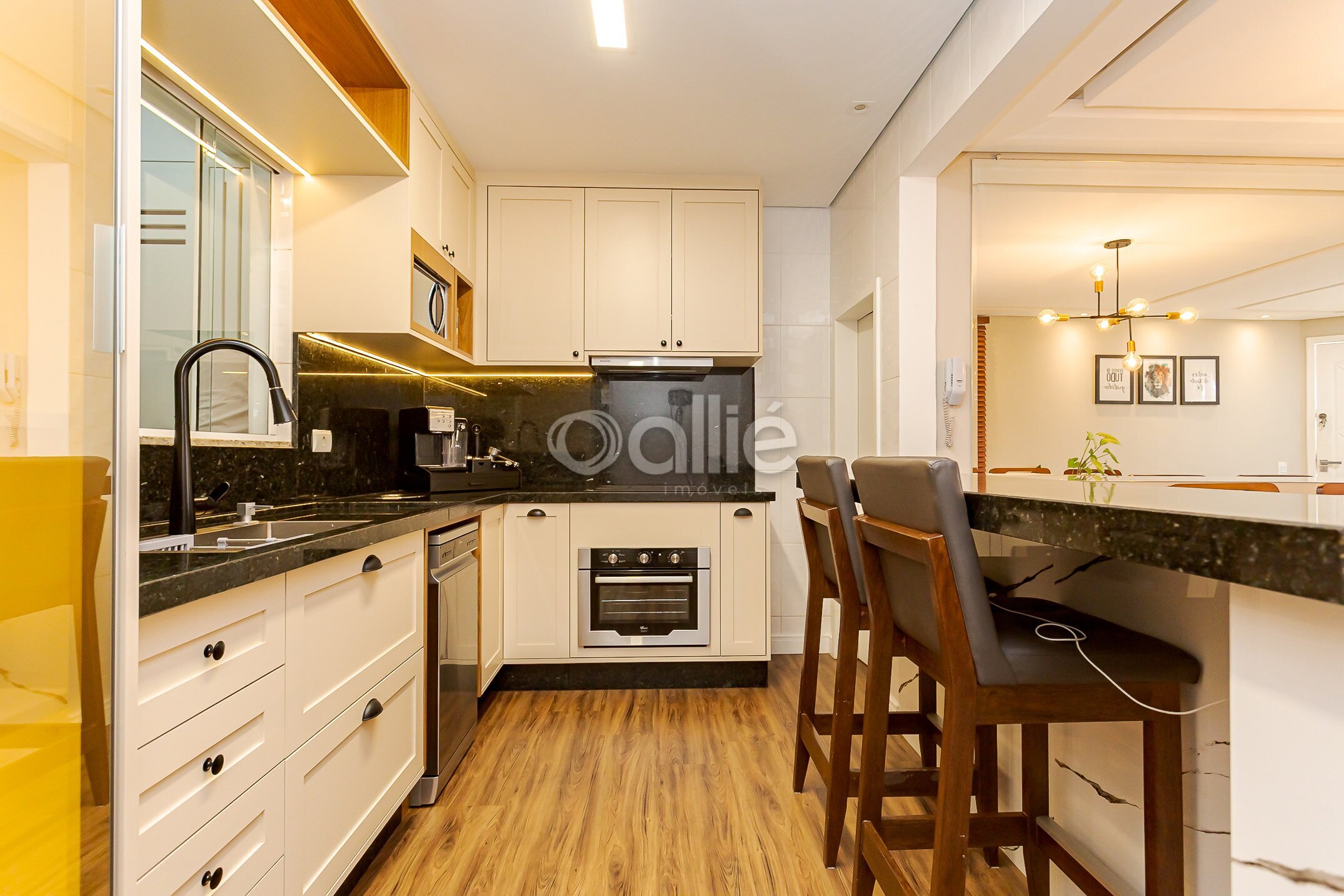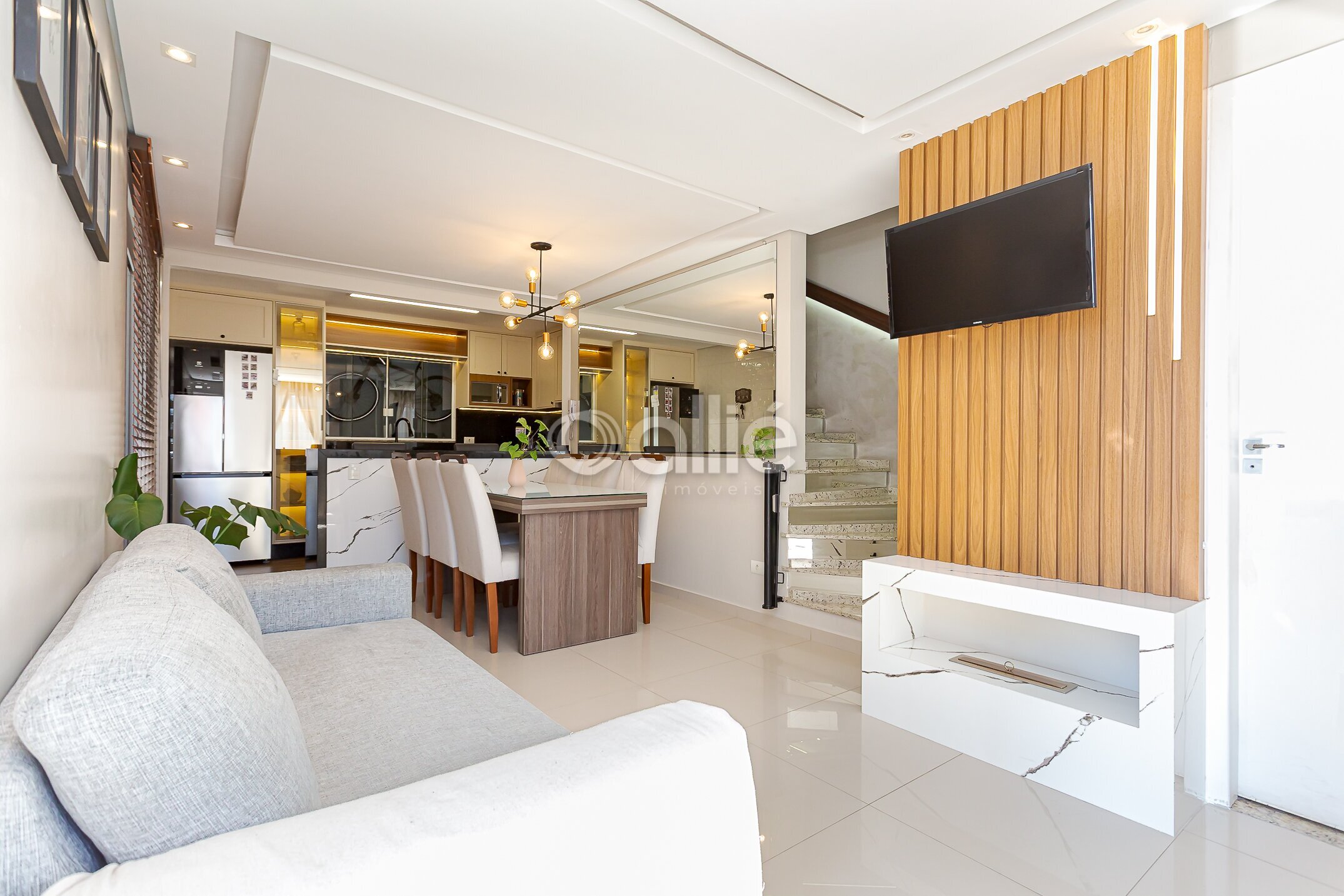 Sala para dois ambientes, integrada à cozinha planejada, toda equipada com armários sob medida, proporcionando praticidade e integração ao convívio diário. Um lavabo completa o ambiente acolherdor.