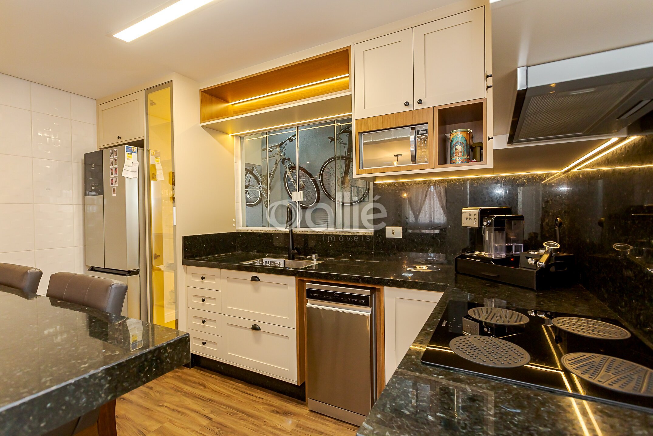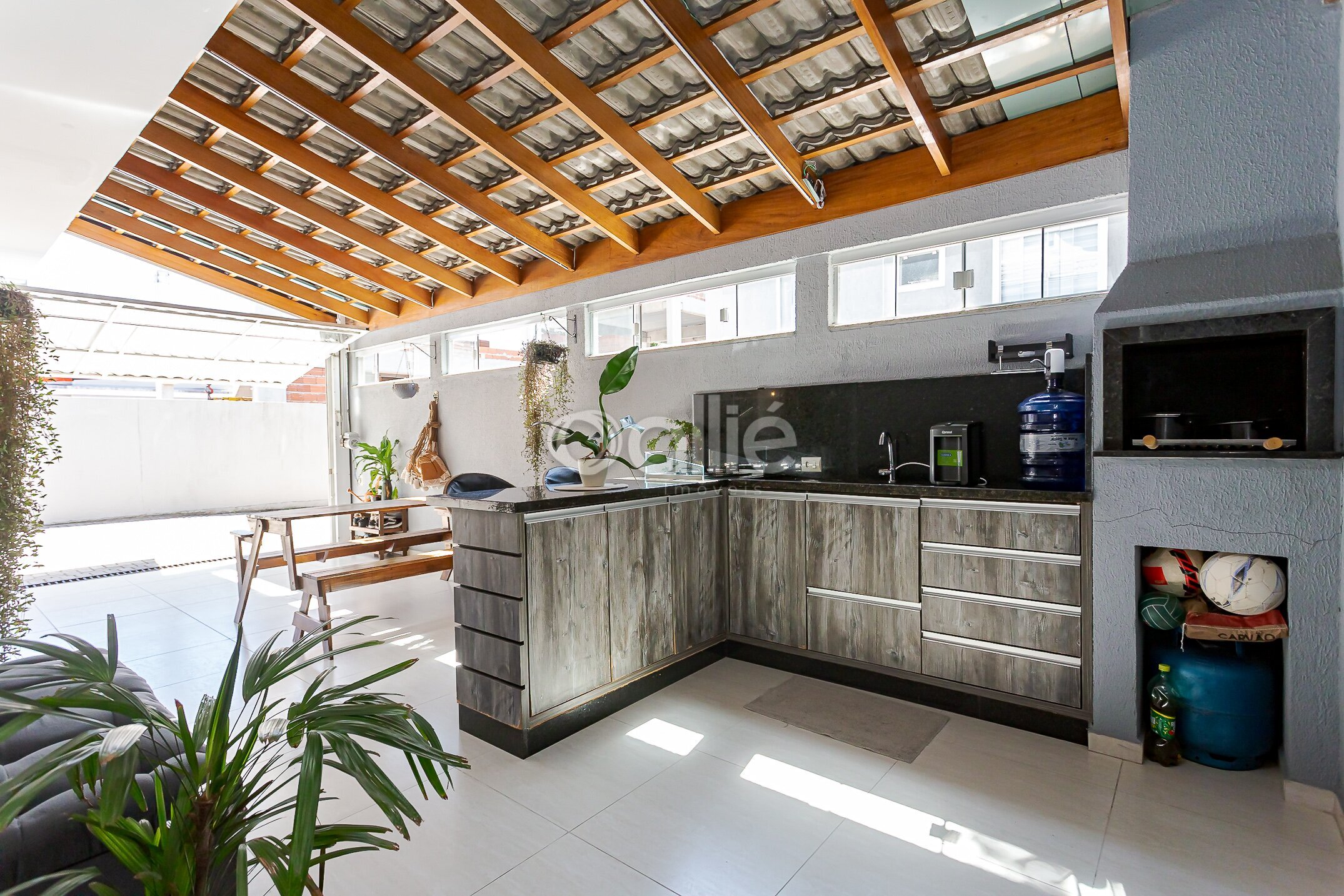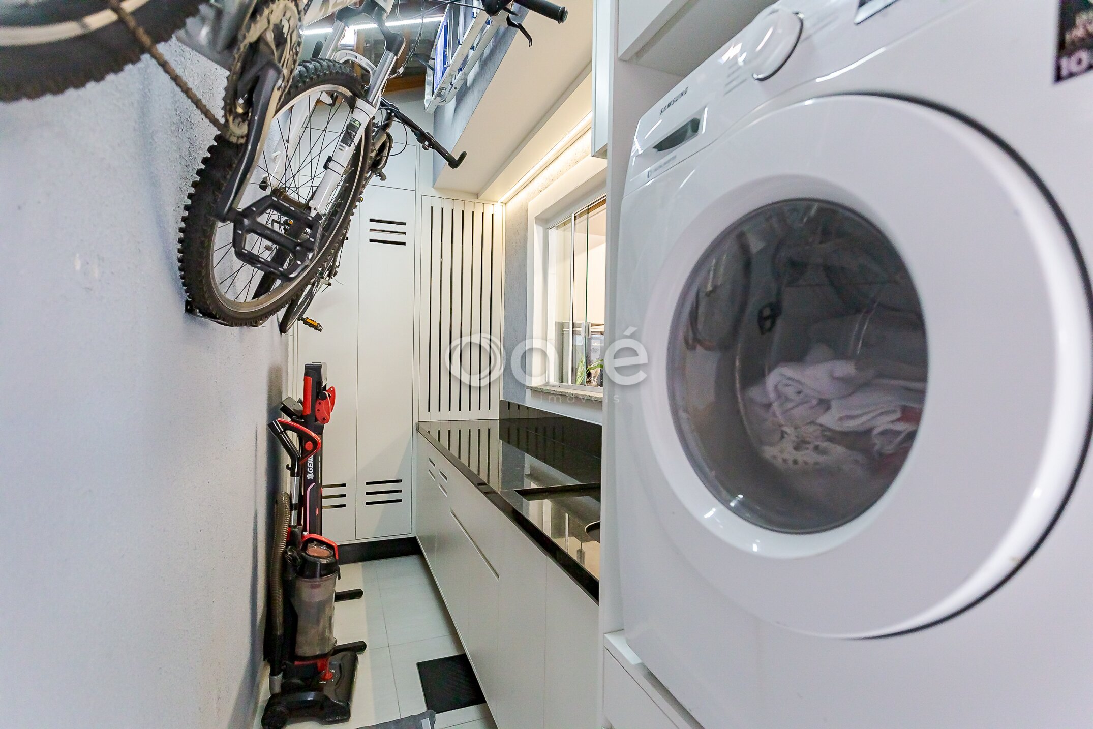 Ao lado, espaço gourmet com churrasqueira, com armarios planejados, pia e balcão de apoio, ideal para receber. Conta ainda com área de serviço separada que tambem conta com armários.