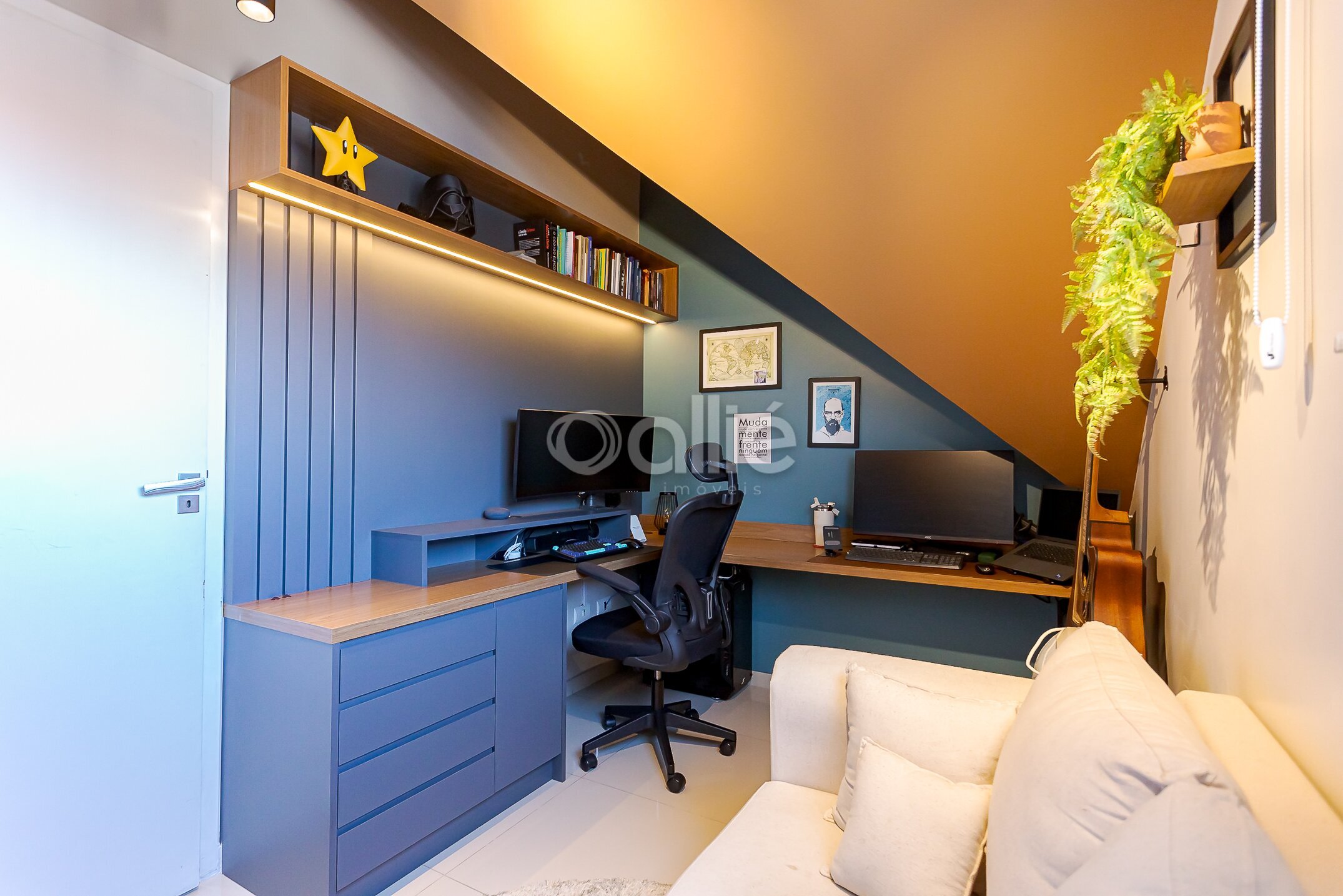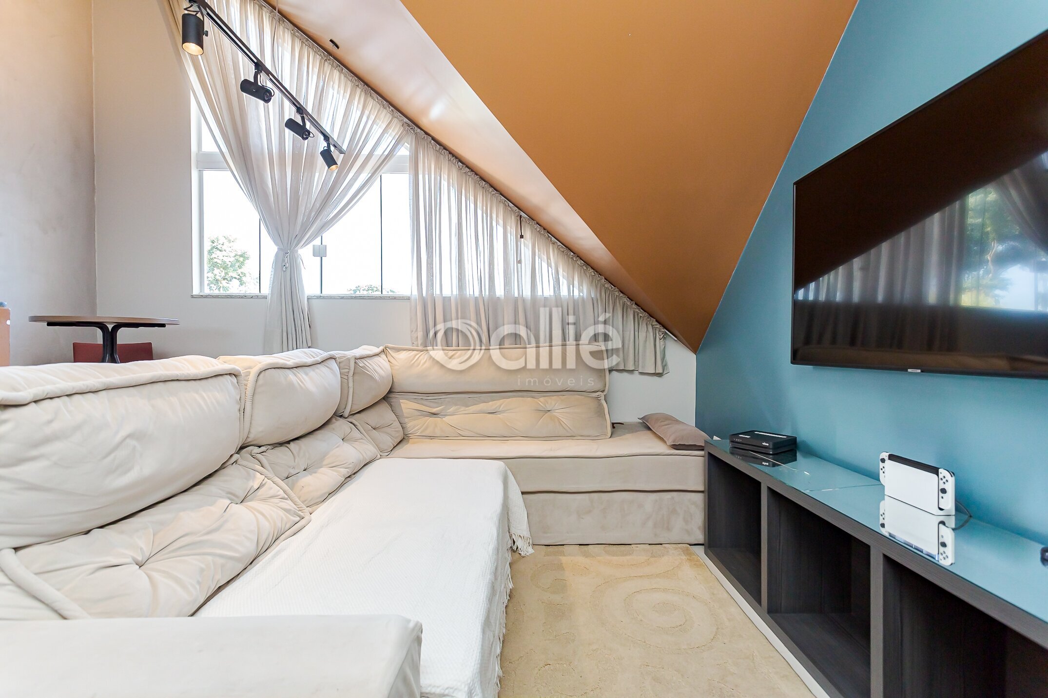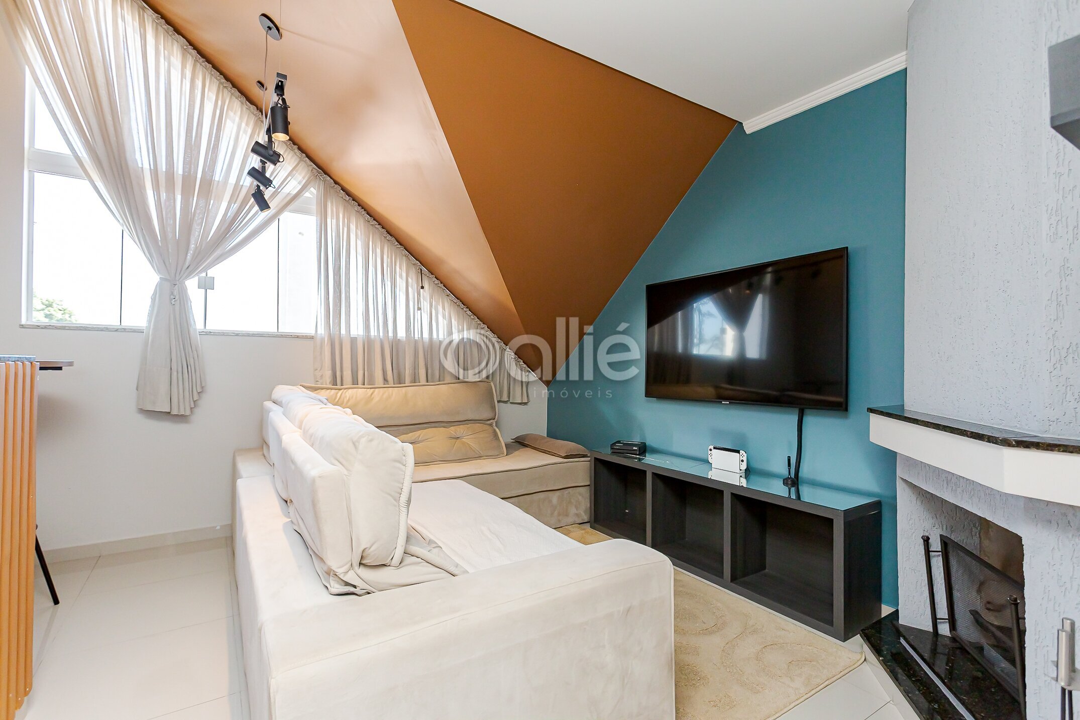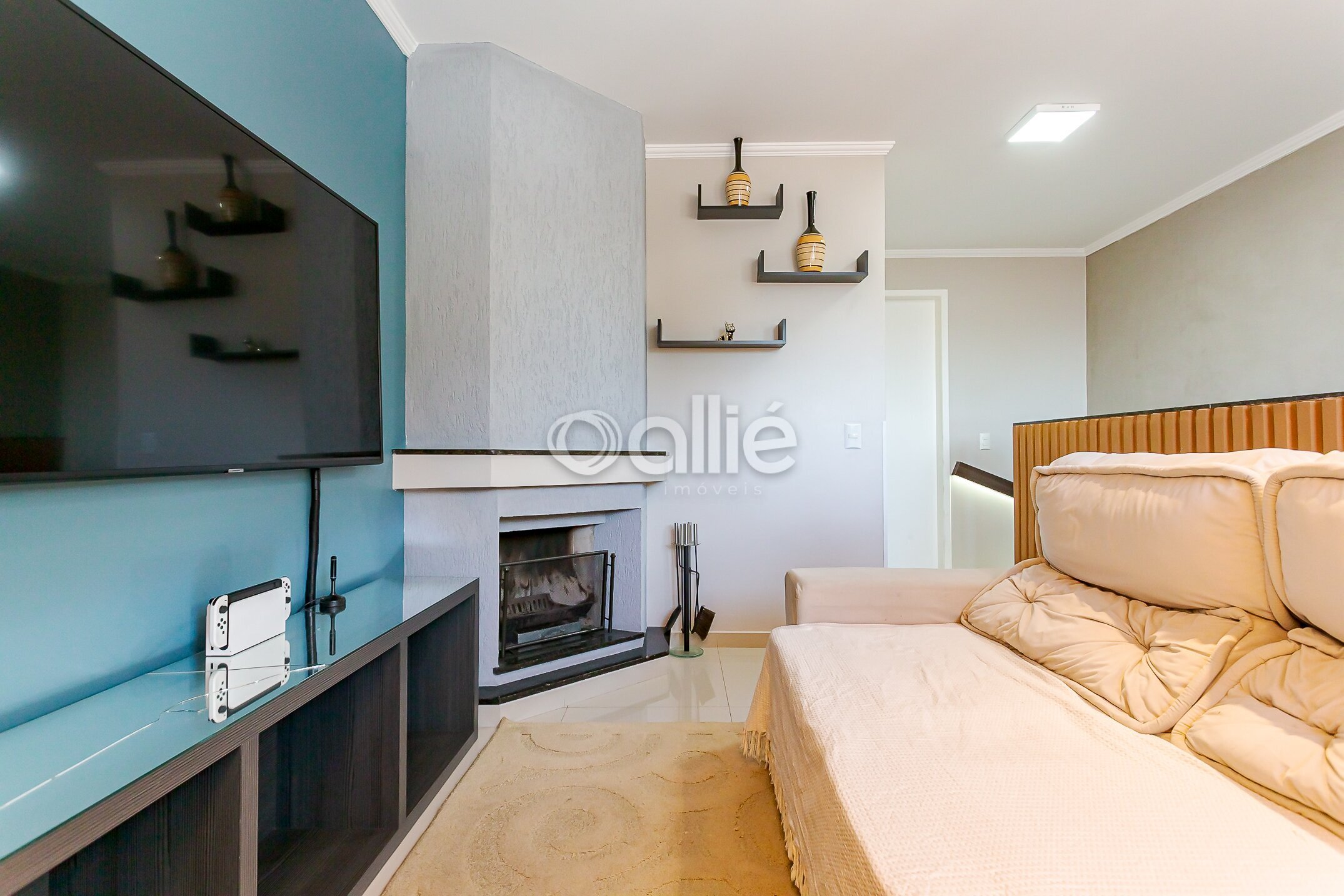 Ático versátil, com um quarto, atualmente utilizado como escritório. No mesmo pavimento você conta com mais um banheiro, sala de TV com lareira e espaço com área de bistrô, criando um ambiente acolhedor e multifuncional.